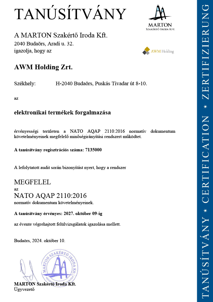 Rendezett, fegyelmezett működésünket mutatja a megszerzett ISO 9001, ISO 14001 és NATO AQAP 2110:2016 tanúsítványunk is.